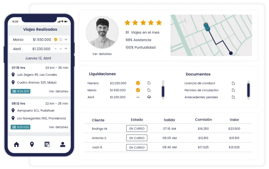 Reportes descargables con toda la información de los viajes por conductor para un mejor análisis.